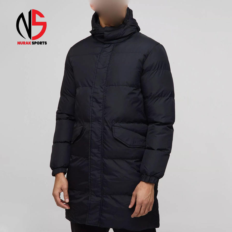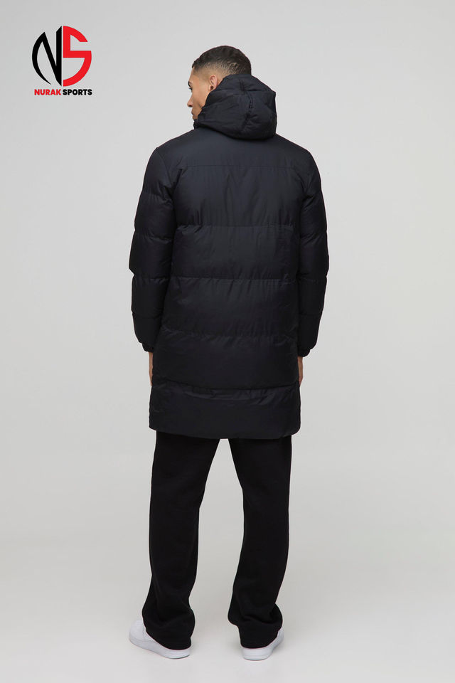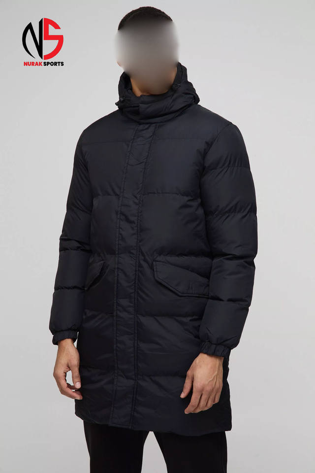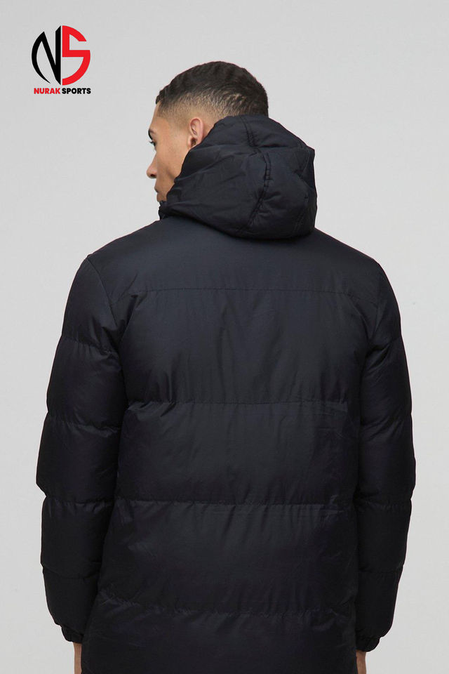 Chaqueta acolchada con capucha de longitud media para hombre, con logotipo personalizado OEM, en negro, a prueba de viento y cálida, de alta calidad, tipo burbuja.
