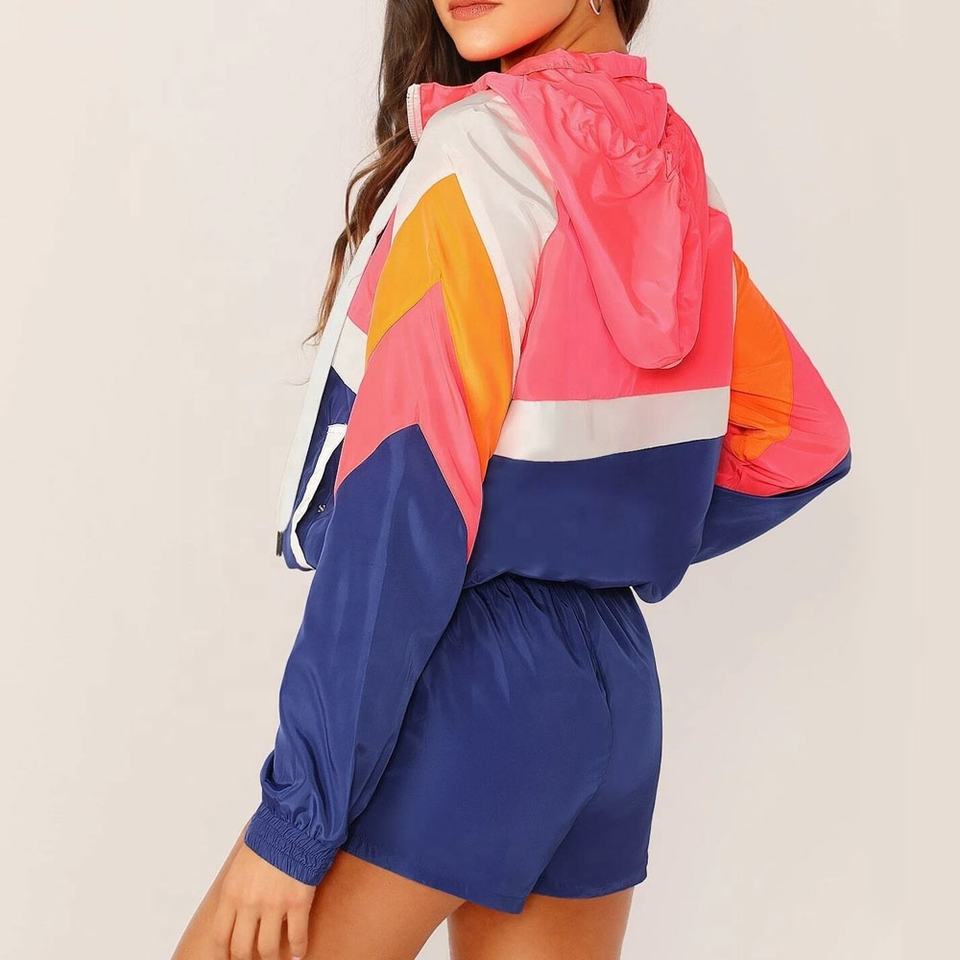 Traje de verano con logotipo personalizado OEM para damas, chándal informal de medio tirón de manga larga con capucha de nailon, pantalones cortos de tiro alto para mujer