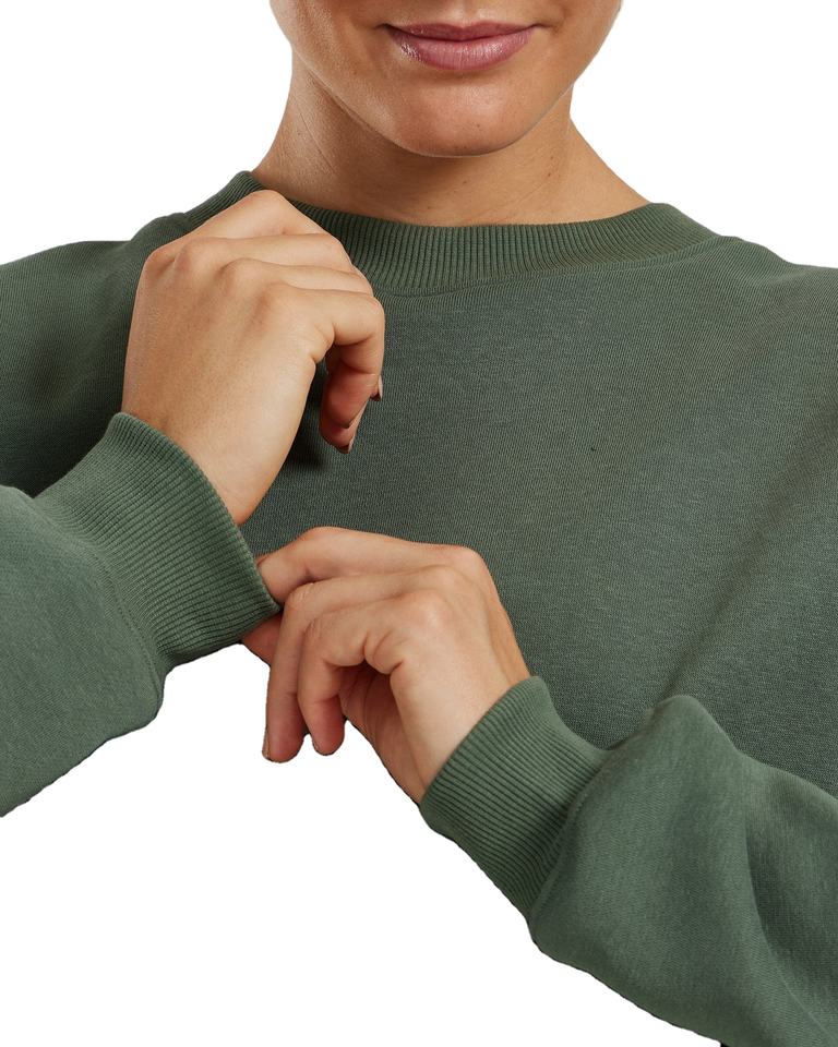 Sudadera con capucha de gimnasio para mujer con logotipo personalizado OEM, sudadera recortada de salvia con cuello redondo, hombros caídos, puños acanalados, dobladillo, patrón sólido en la parte delantera