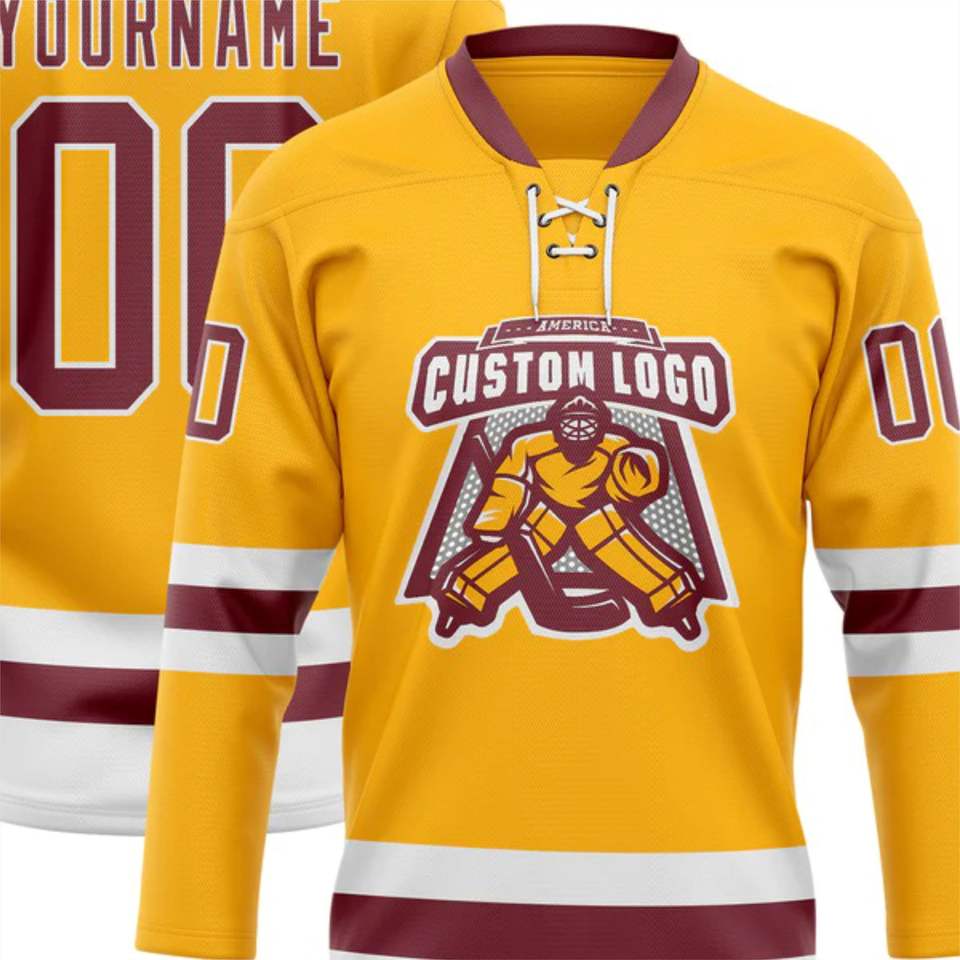 OEM Fabricación personalizada al por mayor personalizado oro carmesí-blanco de alta calidad de encaje Jersey de cuello de hockey