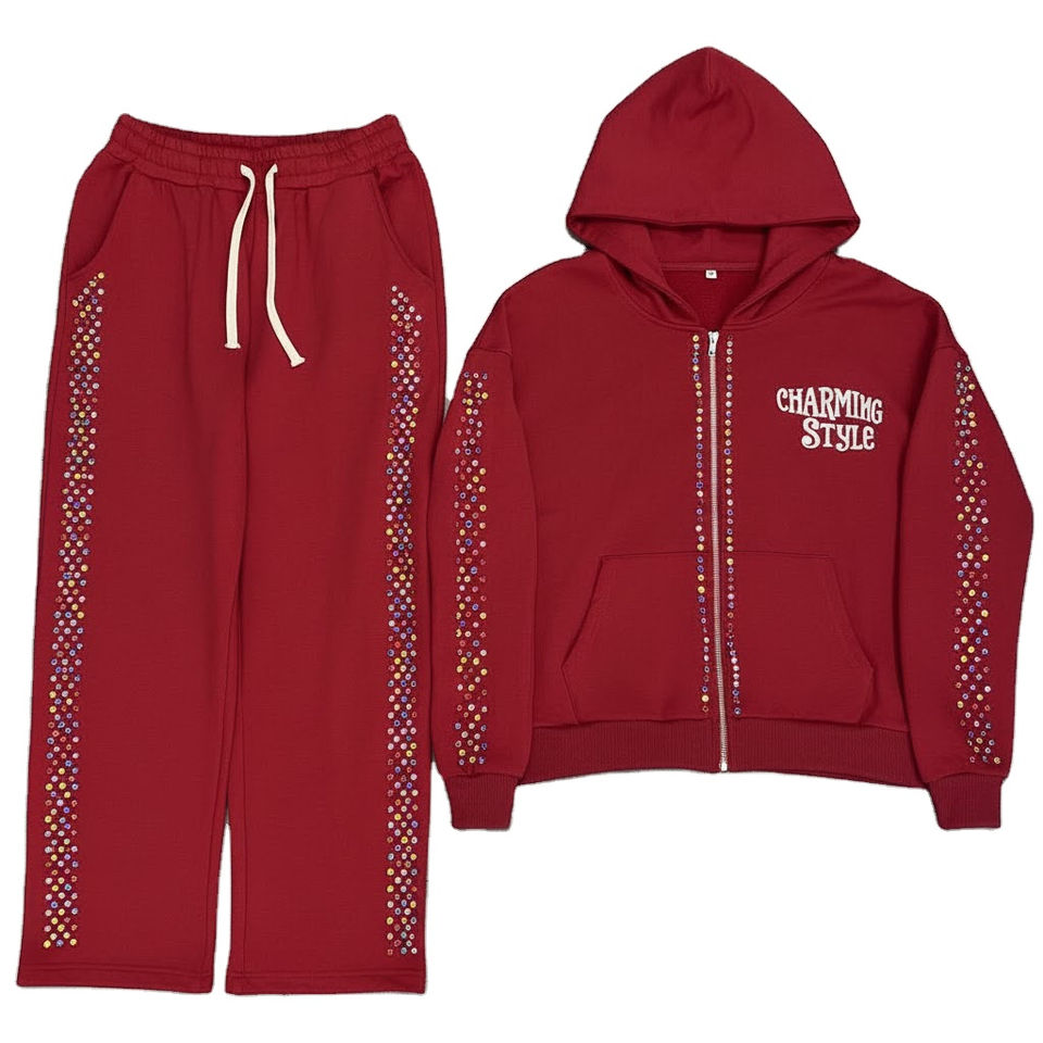 Conjunto de Sudadera con Capucha y Pantalones Acampanados Vintage Desgastados con Cremallera y Lavado Ácido para Hombre, Estilo Urbano con Pedrería, Personalizado OEM