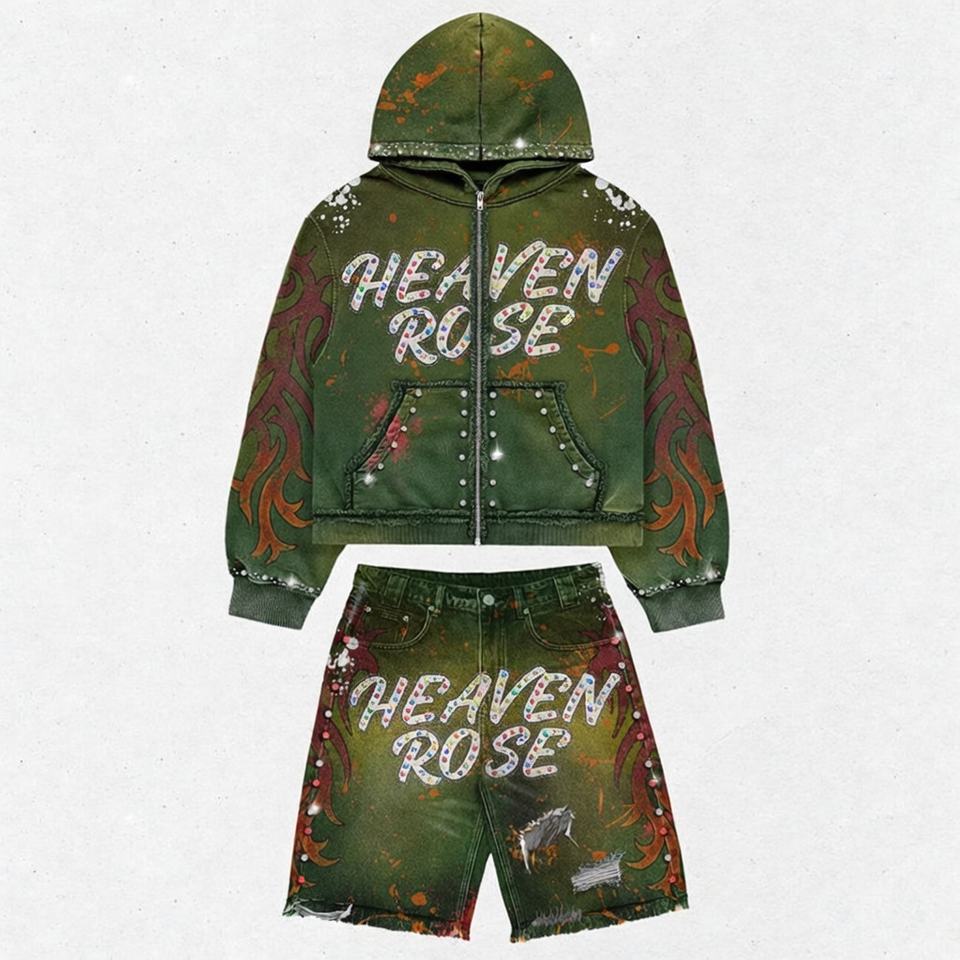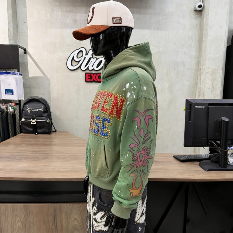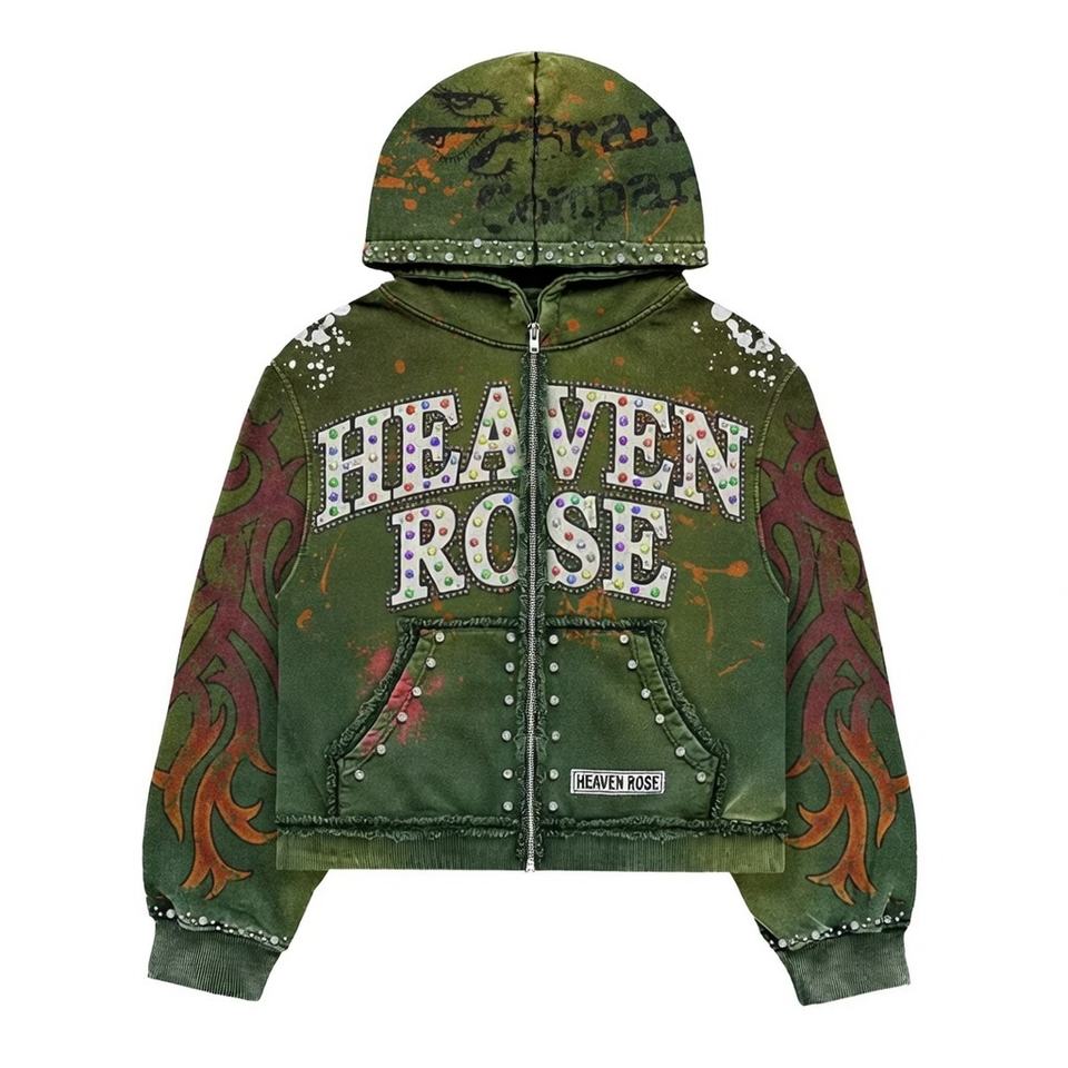 Sudadera con capucha con cremallera personalizada OEM con pedrería, estilo oversize, lavado ácido, estampado de grafiti y llamas, ropa urbana al por mayor, estilo punk Y2K