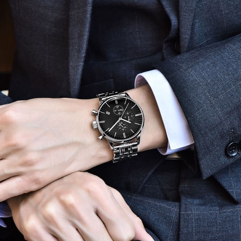 Característica:Buzo, Resistente al agua, Impermeable, Resistente a los golpes, Cronógrafo, Calendario completo, Manos luminosas, Medición de la presión, Tres pequeños aguja, Fecha, Calendario