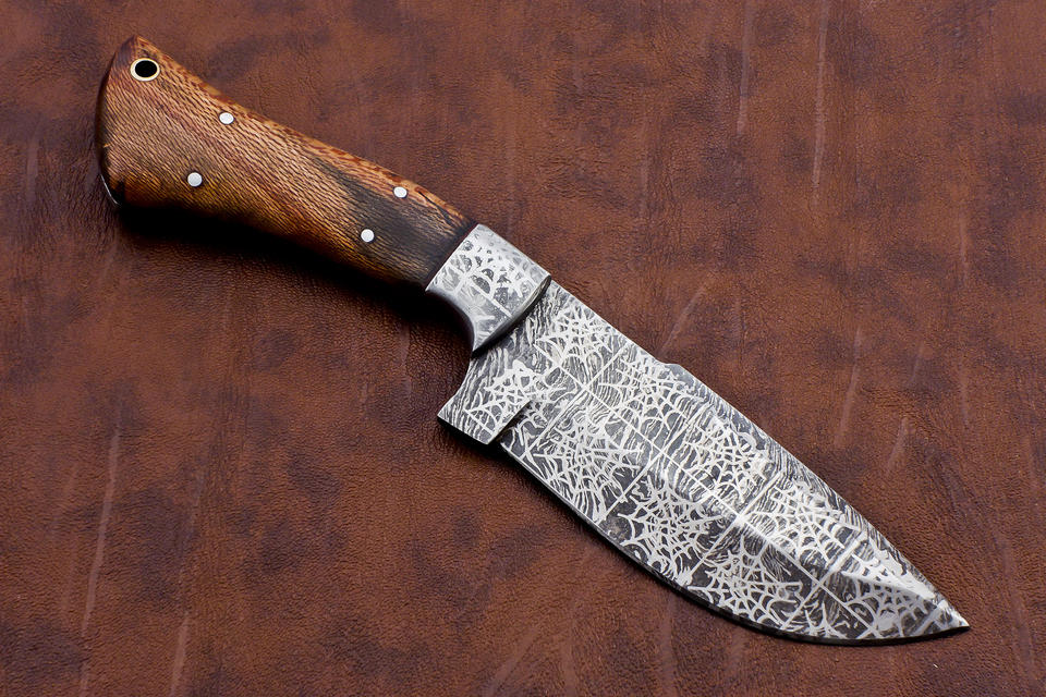 Cuchillo de caza de acero de Damasco personalizable OEM, mango de madera de rosa hecho a mano, Funda de cuero con patrón trenzado para EDC