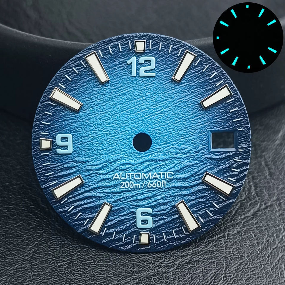 Esfera de Reloj Personalizable OEM con Diseño de Olas Oceánicas en Degradado Azul para Movimiento NH35, Resistente al Agua hasta 200 m, Marcadores Luminosos C3