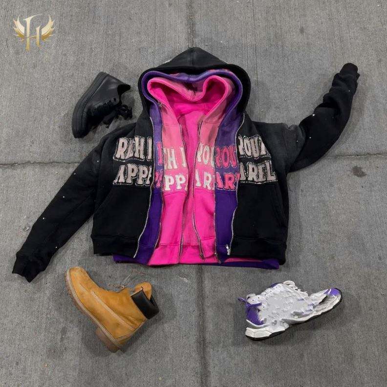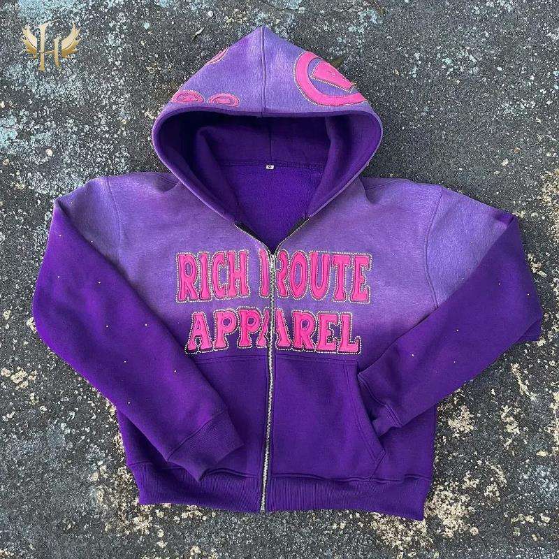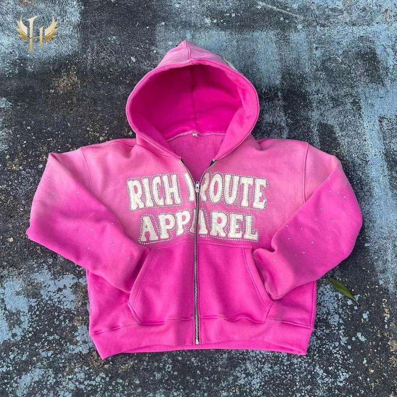 Sudadera con capucha extragrande personalizable OEM para invierno, con logotipo bordado de pedrería, forro polar de algodón 500GSM, cierre de cremallera, corte con borde, lavado ácido, 100% algodón