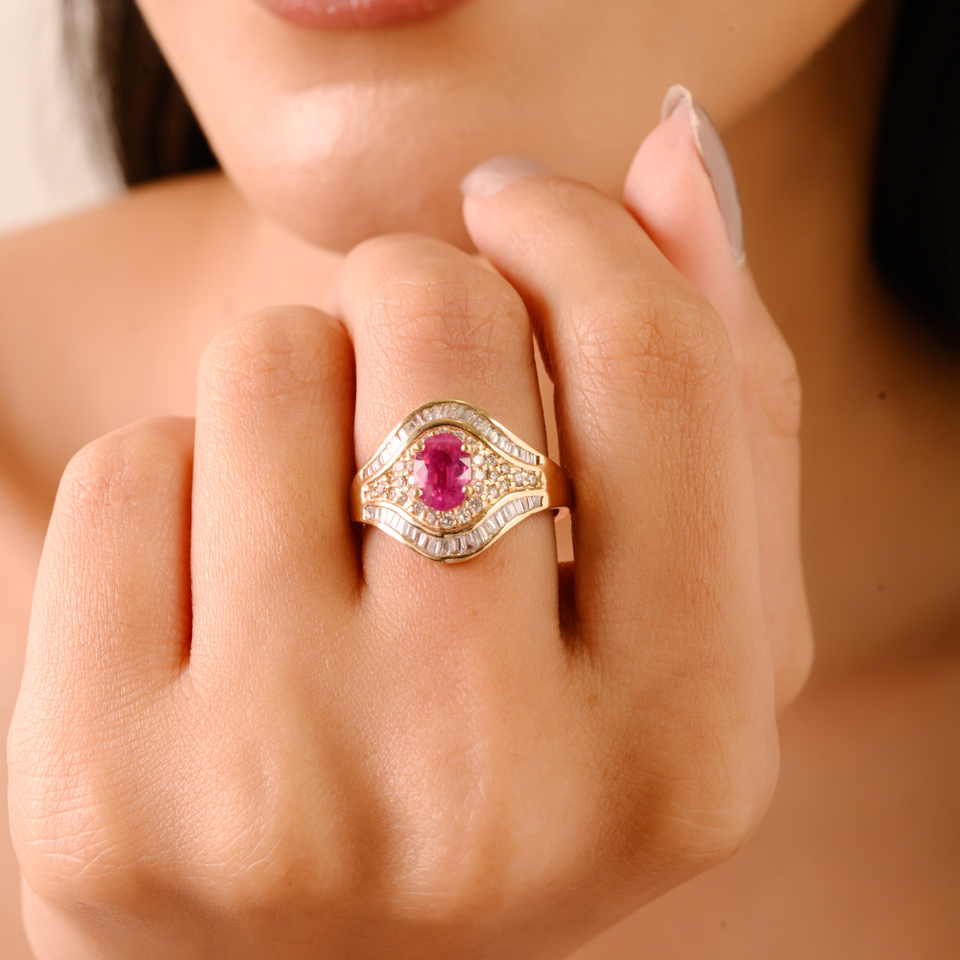 Anillo de declaración vintage de oro amarillo real K14 con rubí y diamante engastados con garras, personalizado OEM, Novedades, Joyería al por mayor
