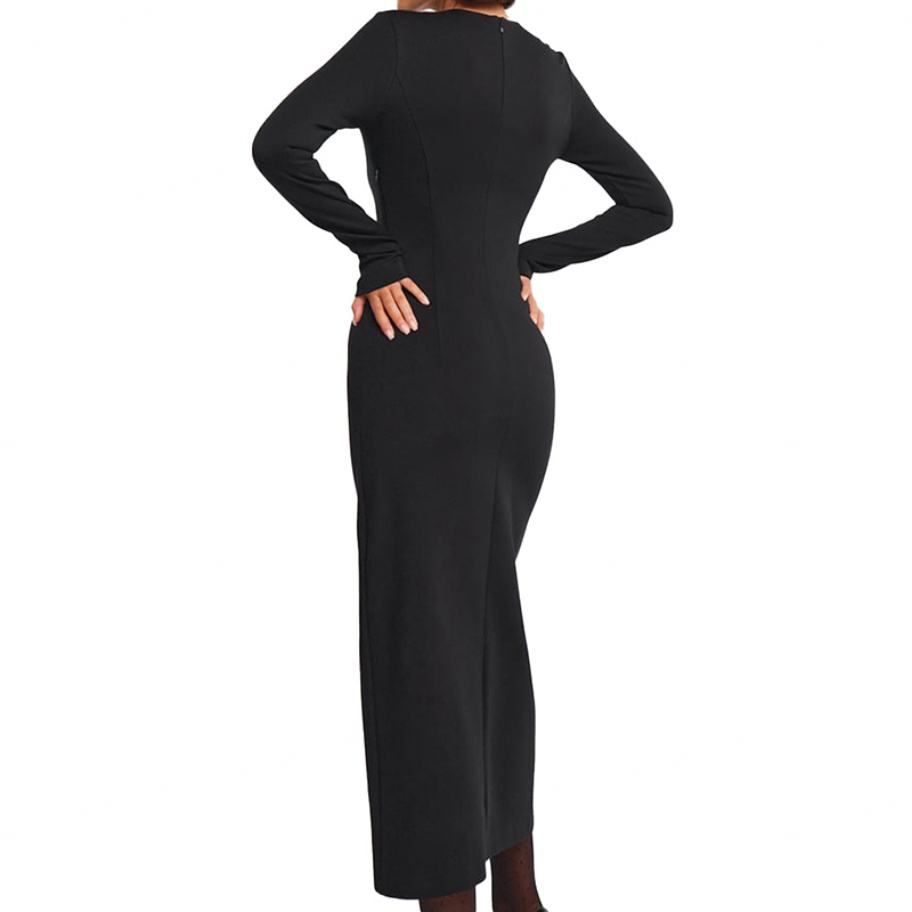 Vestidos Midi Ajustados de Alta Calidad Personalizados OEM, Diseño Sexy Negro de Otoño, Cuello Alto, Manga Larga, Método de Tejido de Punto en Capas