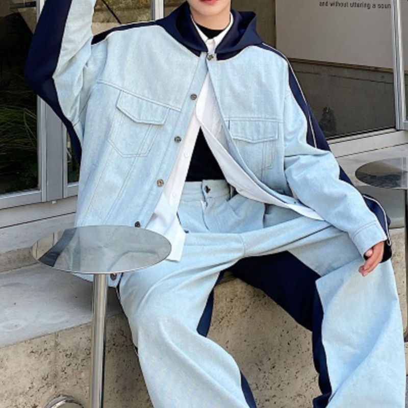 Conjunto de chaqueta vaquera lavada con parche de traje vaquero de dos piezas personalizado de fábrica OEM, conjuntos de vaqueros azules para decoración de invierno para hombre