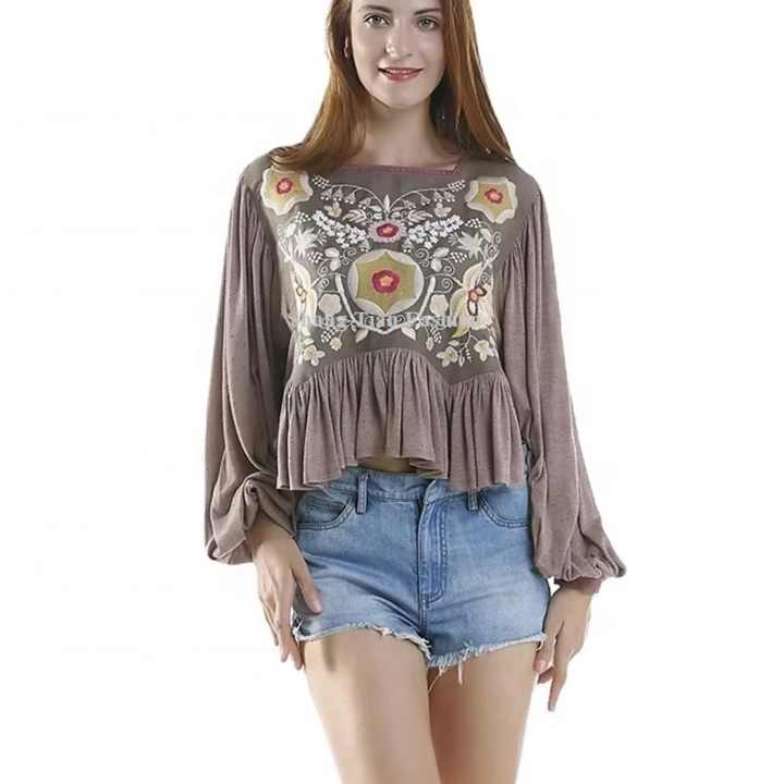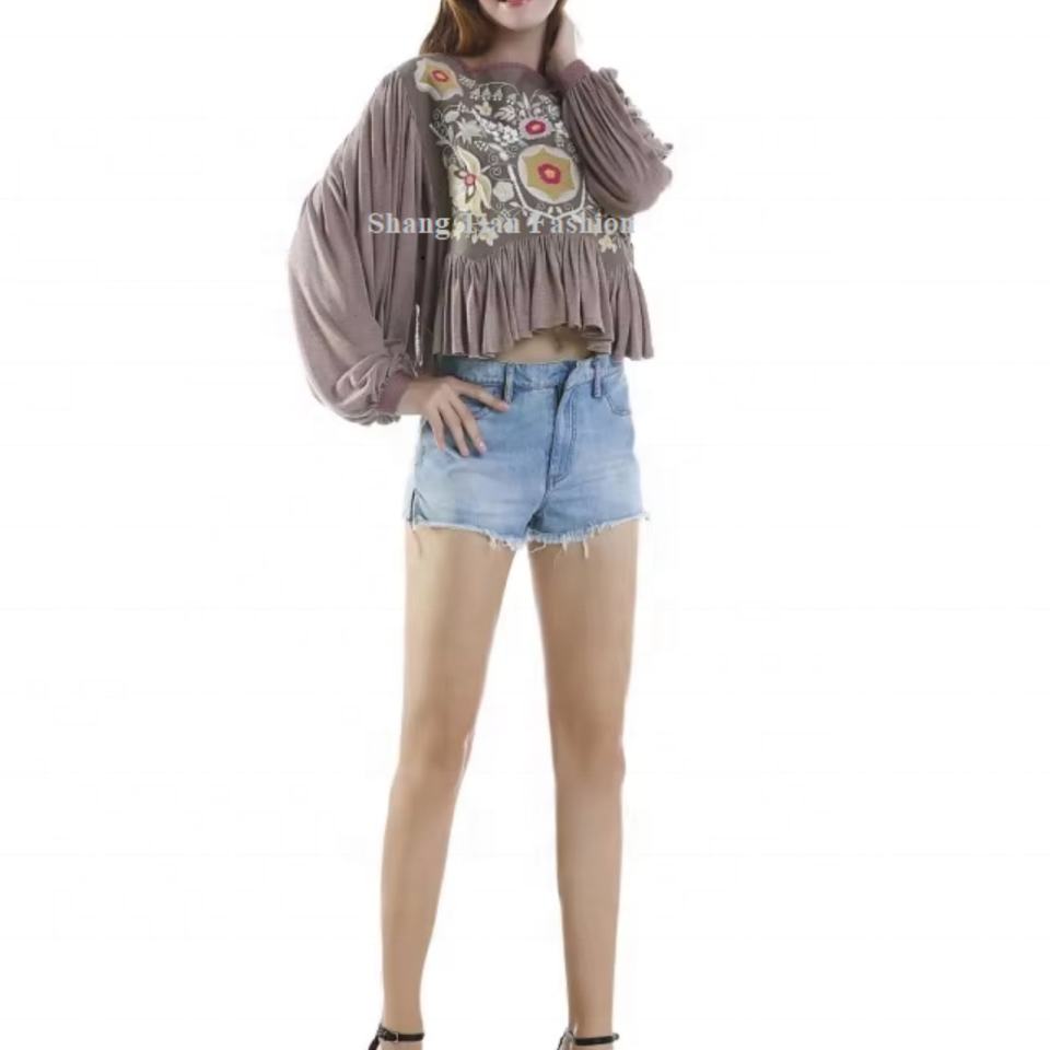 Blusa de Punto para Mujer, Cuello Cuadrado, Manga Abullonada, Bordado Floral, Volantes en el Bajo, Otoño, Buena Calidad OEM
