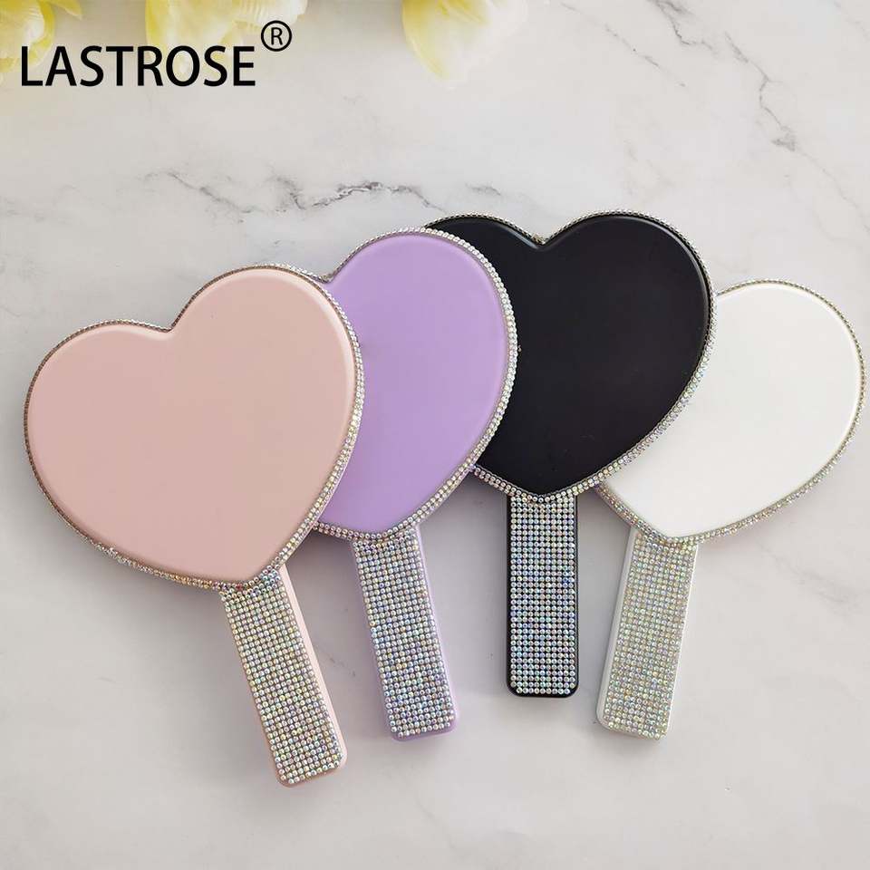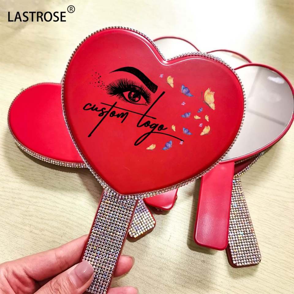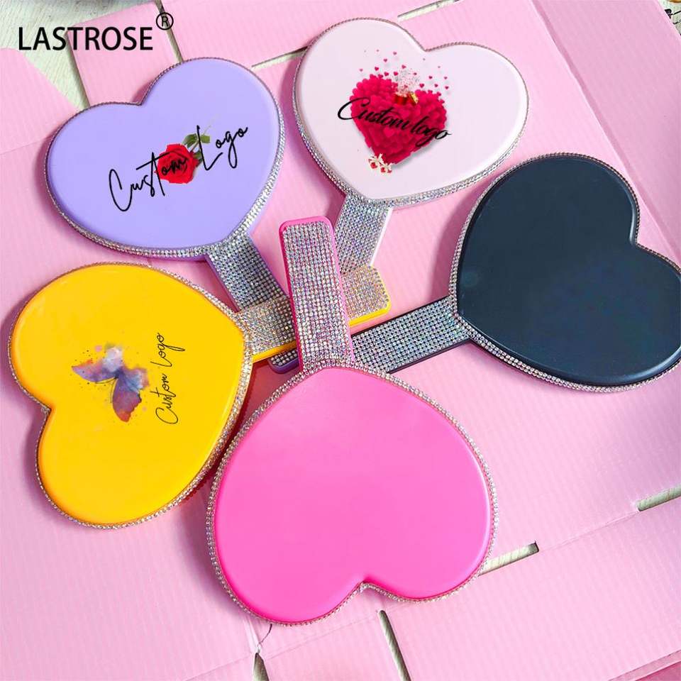 Espejo de Maquillaje de Mano con Forma de Corazón OEM con Iluminación, Diamantes de Imitación y Pedrería, Venta al por Mayor, Marca Privada