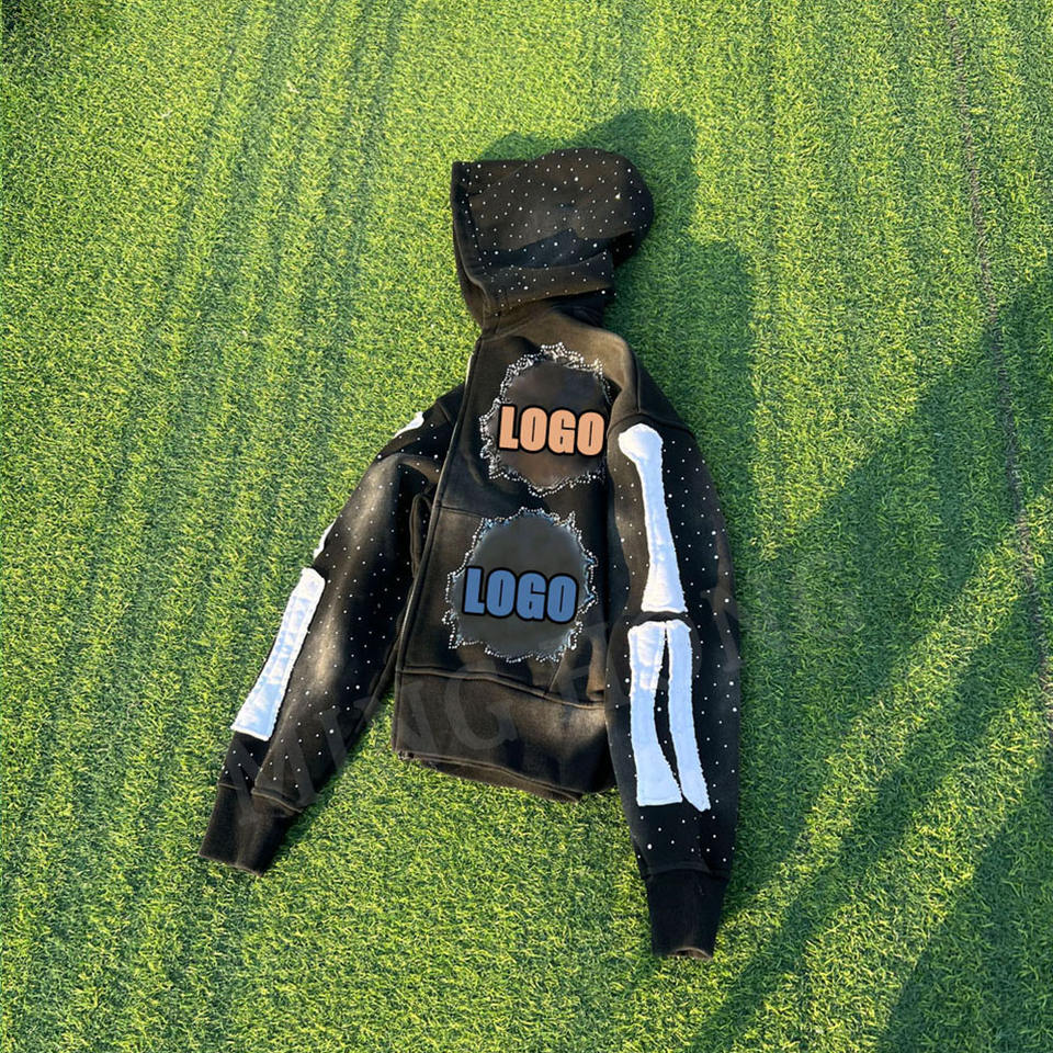 OEM de alta calidad apliques parche bordado Rhinestone Sudadera con capucha recortada lavado Zip Up sudaderas con capucha