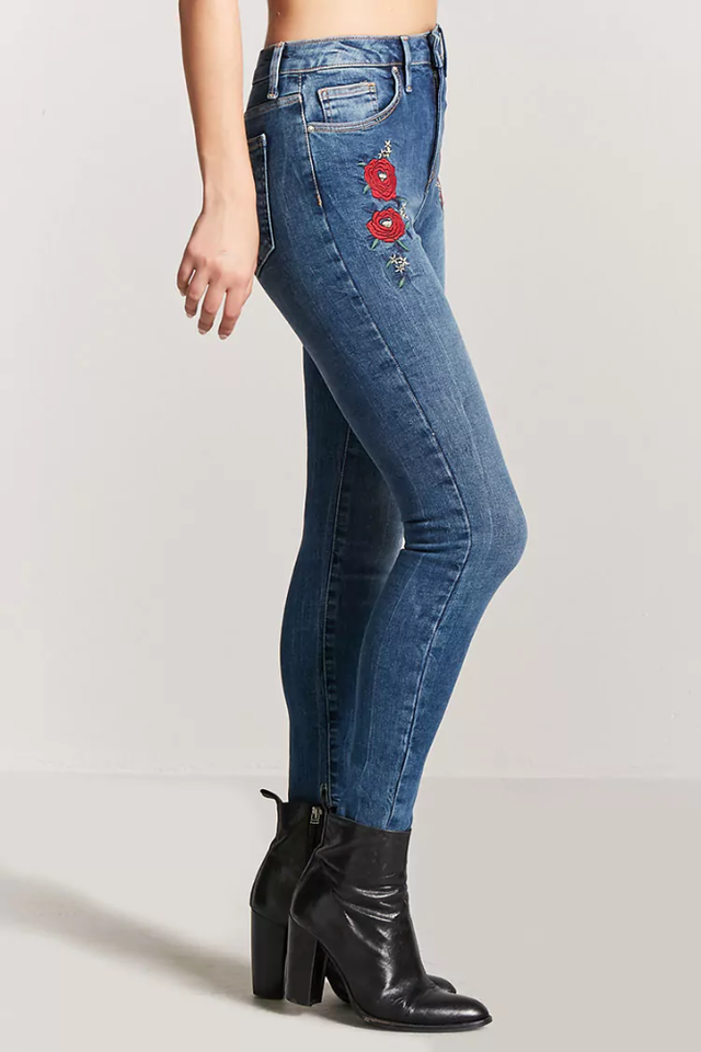 OEM lujo personalizado victorioso estiramiento Rosa Embro mujeres Floral bordado Skinny Jeans 014