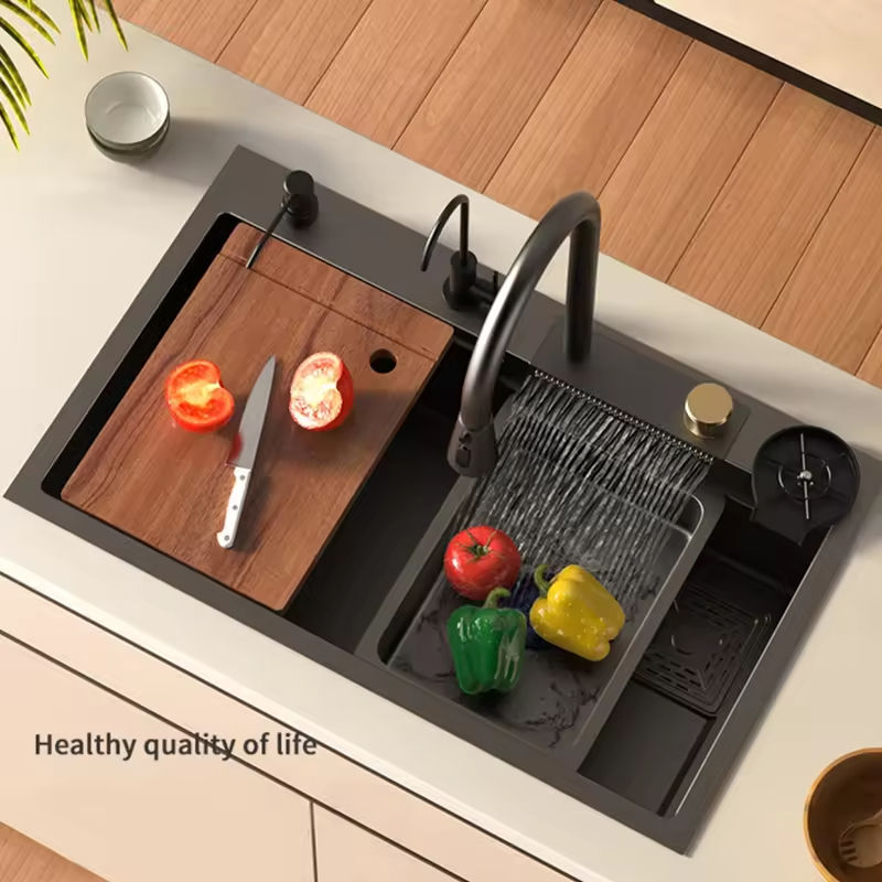 OEM lujo cocina mosca lluvia cascada sacar grifo miel peine negro con dispensador de jabón fregaderos de cocina para apartamento