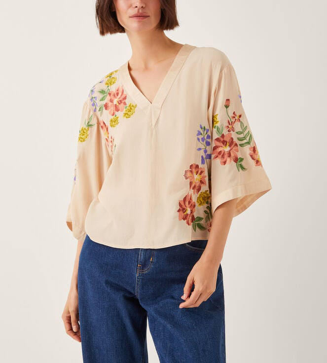 Blusa bordada floral de viscosa de talla grande de lujo OEM para mujer Top con cuello en V de manga tres cuartos para ropa informal de verano