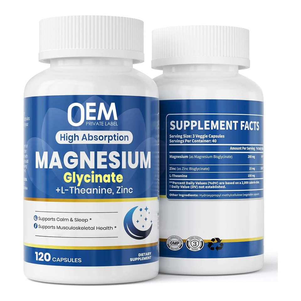 Cápsulas de Glicinato de Magnesio OEM, Suplemento Complejo de Magnesio con L-Teanina y Zinc para la Relajación, el Sueño y la Recuperación Muscular