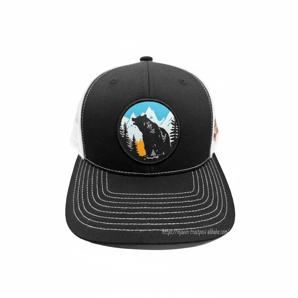 Sombreros de camionero de color de malla negro/personalizado, sombreros de camionero con parche de logotipo tejido con bordado 3D personalizado, MOQ bajo