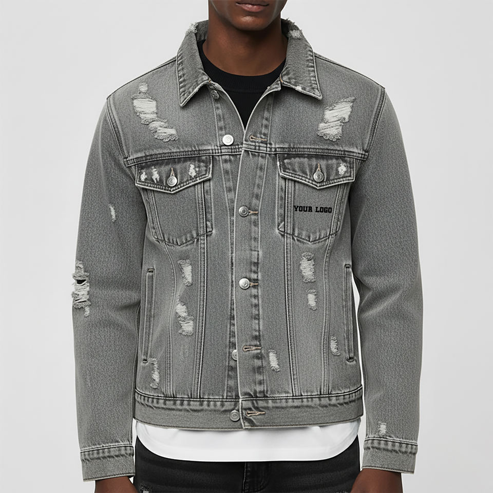 Chaqueta de Mezclilla de Algodón con Logotipo Bordado Personalizado, Cuello Camisero, Lavado Vintage y Pedrería para Hombre, Fabricante OEM