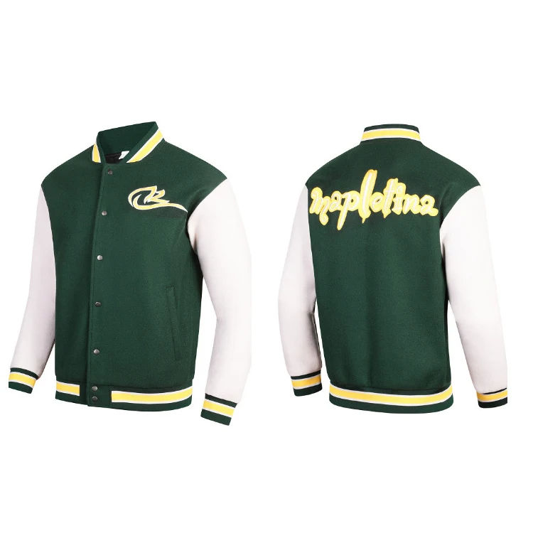 Chaqueta universitaria de béisbol con mangas de cuero y bordado con logotipo personalizado de fabricante OEM para hombre, diseño de retazos con cuello levantado, venta al por mayor