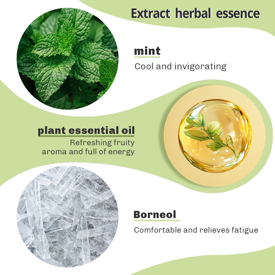 mentol, Alcanfor, Aceite de Eucalipto, Aceite de Menta, Aceite de Lavanda, Mezcla de Aceites Esenciales, Extracto Herbal, Extracto Natural de Plantas, Aceite de Aromaterapia, Extracto de Menta, Fórmula Refrescante, Aceite Esencial Orgánico, Aceite Esencial Puro, Fórmula Herbal, Aceite Esencial Compuesto