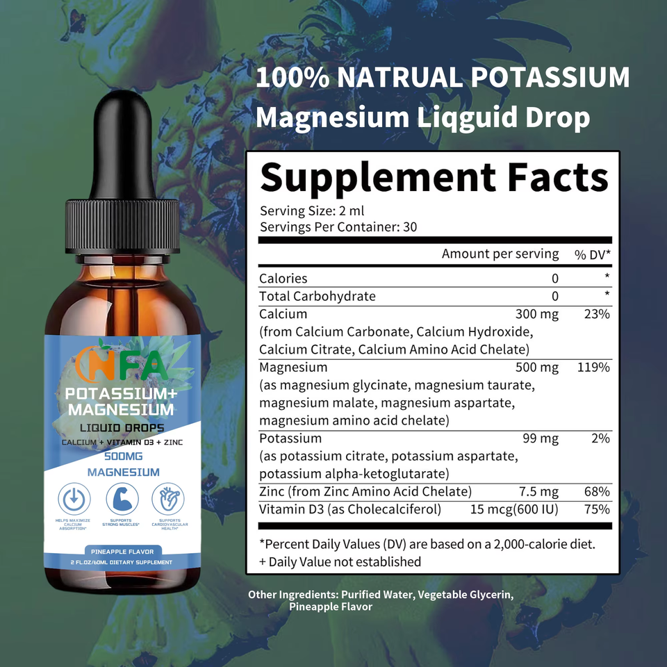 OEM/ODM Complete 5-In-1 Suplemento Fórmula 100% Gotas líquidas de magnesio y potasio natural para soporte del sueño del corazón óseo