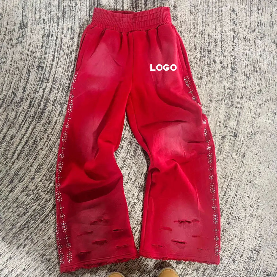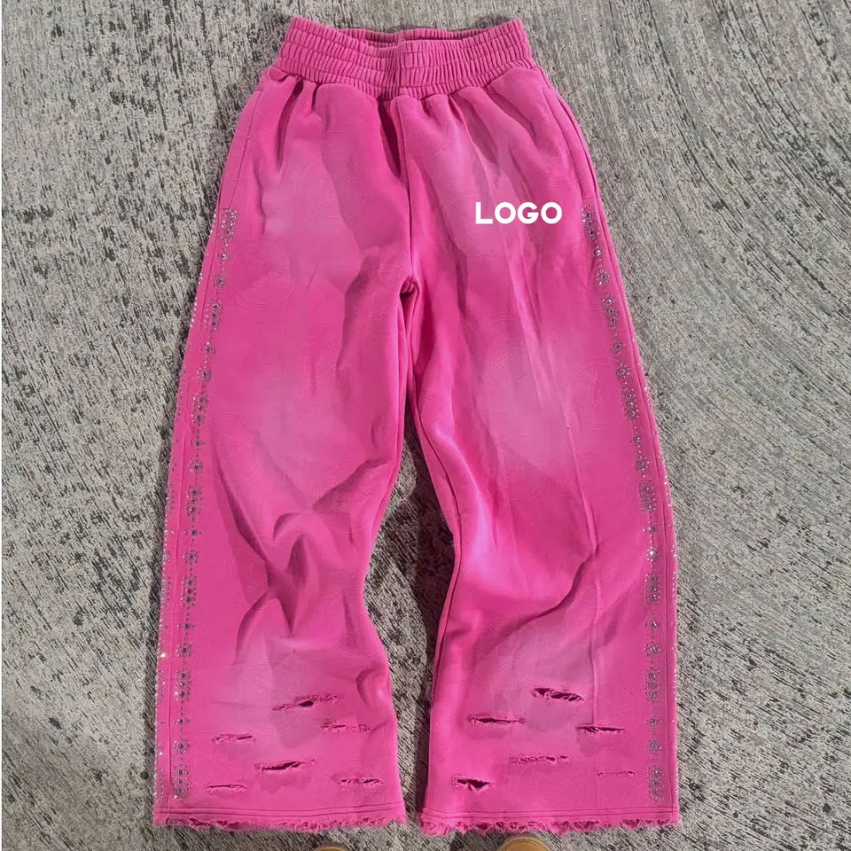 Pantalones de chándal de pierna recta lavados desgastados gruesos con adornos de diamantes de imitación personalizados OEM ODM, pantalones de chándal teñidos lisos