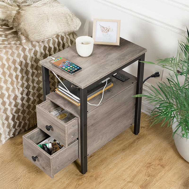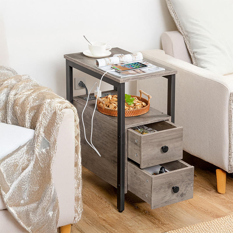 OEM ODM personalizado rústico sala de estar muebles rústicos mesa auxiliar con estación de carga 2 cajones de madera armario lateral para sofá