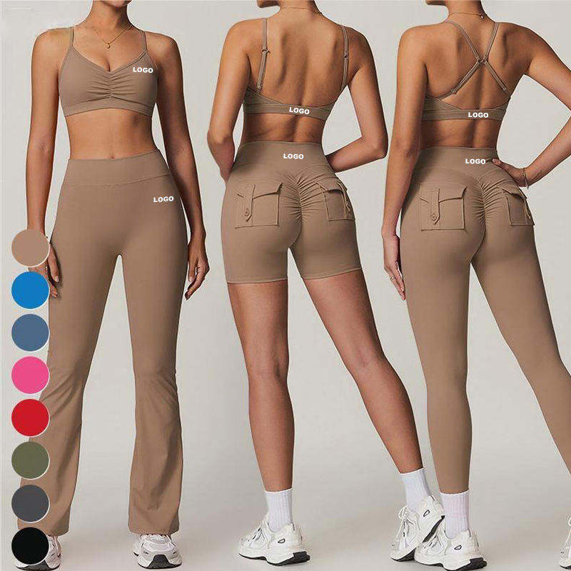 OEM ODM Gimnasio Fitness Conjuntos de cintura alta Scrunch trasero Entrenamiento Yoga Leggings Pantalones acampanados 4 piezas Sujetador Biker Shorts Sólido Tallas grandes