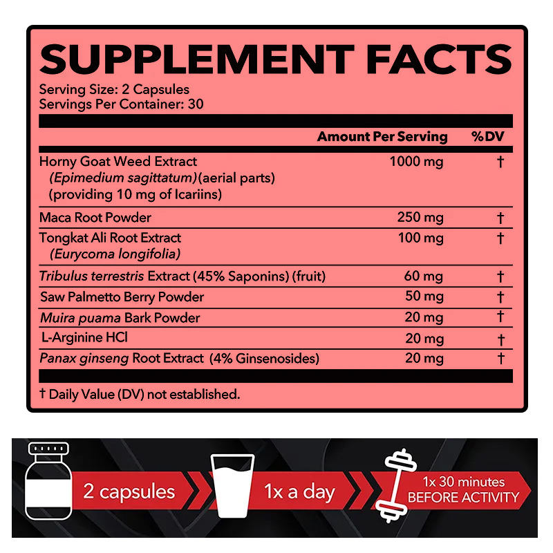 Ingrediente principal:Extracto de hierba de cabra caliente, Polvo de raíz de Maca, Extracto de Tribulus Terrestrics, Saw Palmetto Berry en polvo, Muira Puama corteza en polvo, L-Arginina HCl, Extracto de raíz de Panax Ginseng
