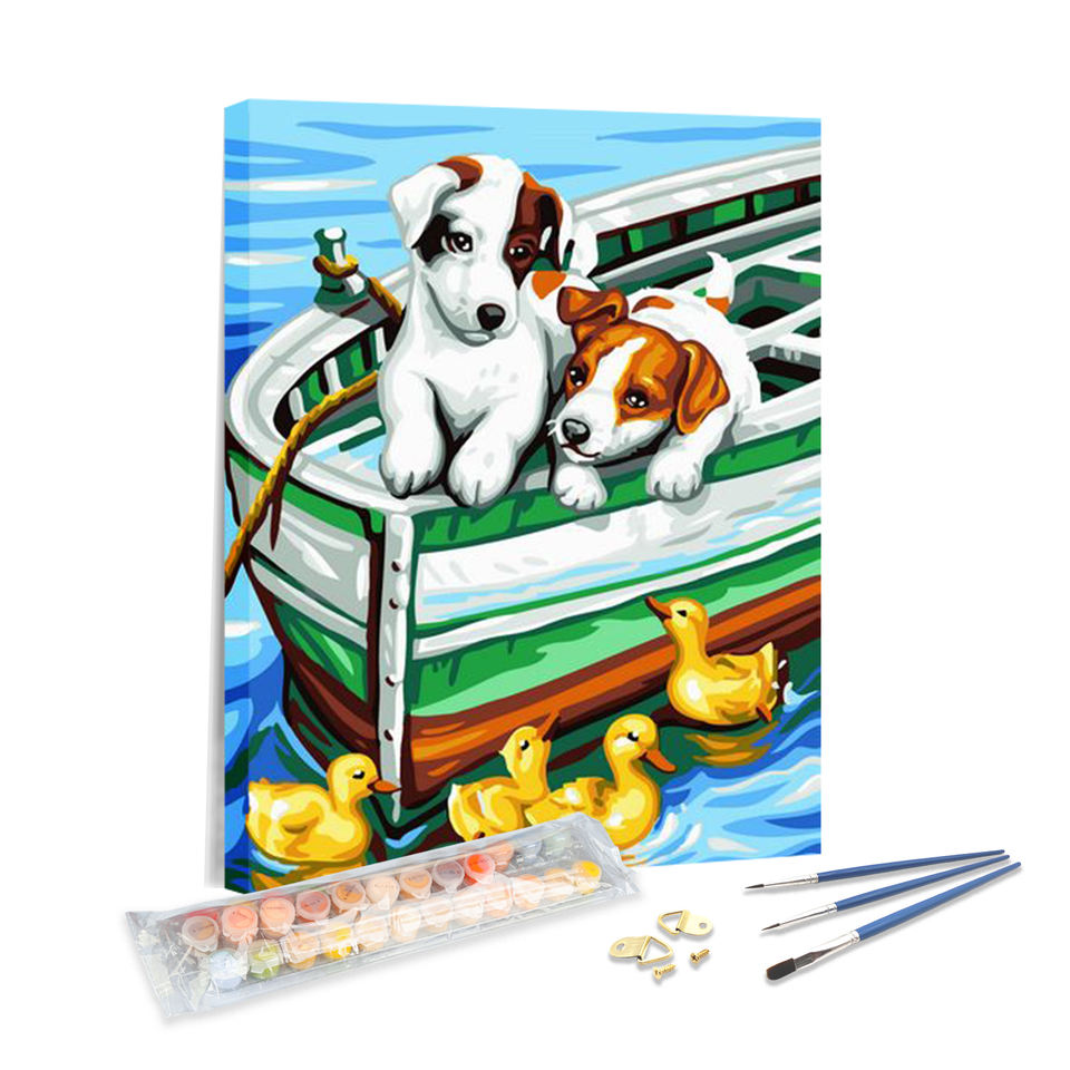 Kit de Arte en Lienzo para Pintar por Números OEM ODM: Cachorros Jack Russell en Bote con Patitos