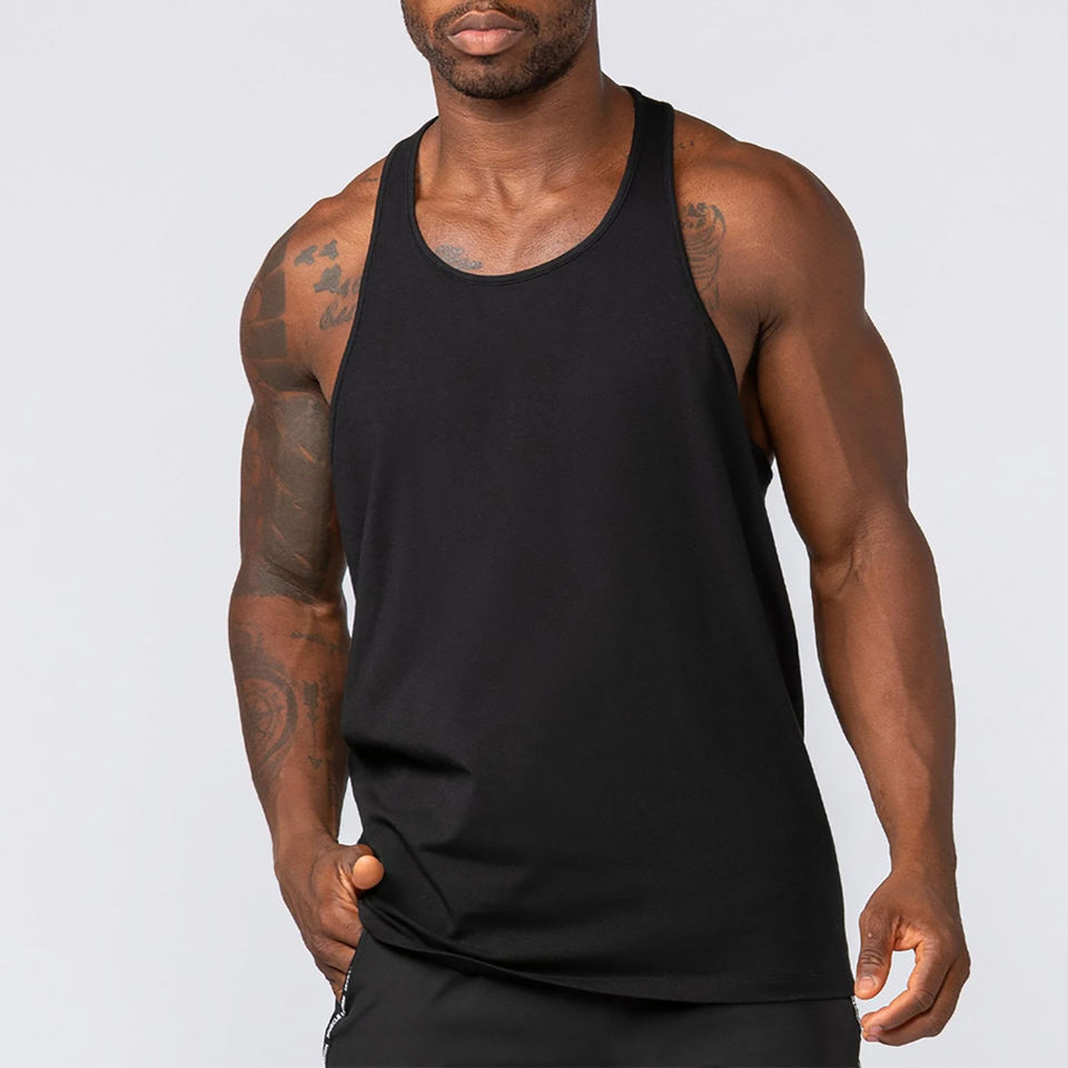 Servicio OEM ODM en un solo color negro sólido. Buen proveedor con logotipo propio. Ropa deportiva con logotipo totalmente personalizado. Camisetas sin mangas para hombre con impresión de logotipo.