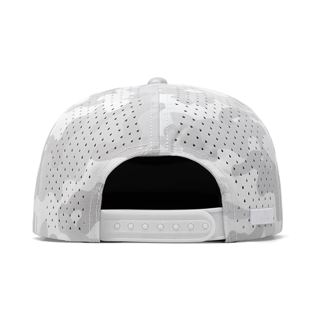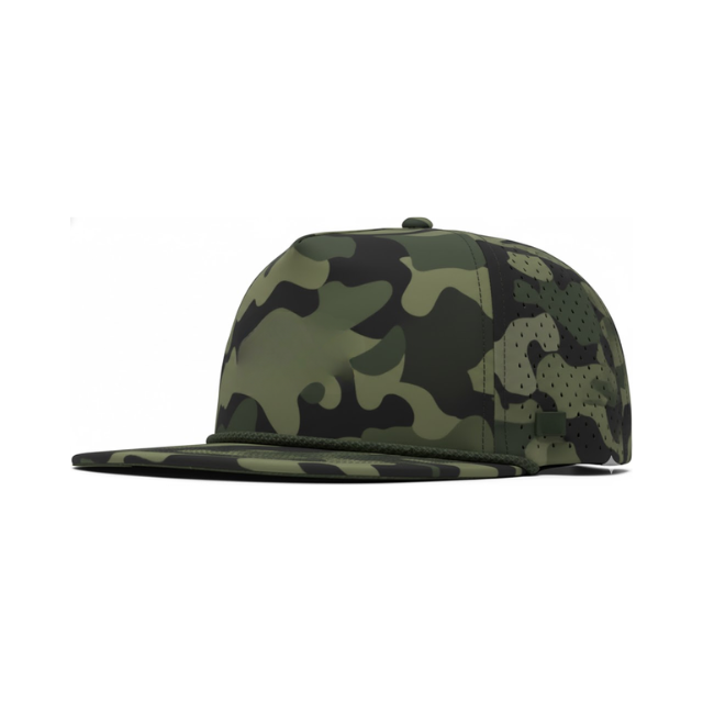 OEM ODM estructurado 5 paneles corte láser agujero perforado sombrero ala plana camuflaje impermeable personalizado en blanco cuerda gorras de golf para correr