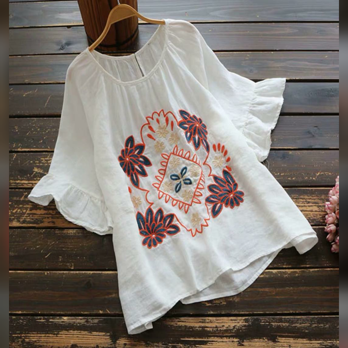 Blusa de Lino para Mujer, Talla Grande, Estilo Modesto, Cuello Redondo, Antiarrugas, Manga Corta, Primavera Verano, Alta Calidad, Venta al Por Mayor