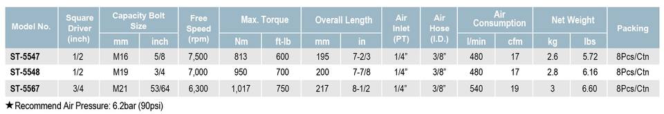 Consumición del aire:17cfm(480l/minuto), 19cfm(540l/minuto)