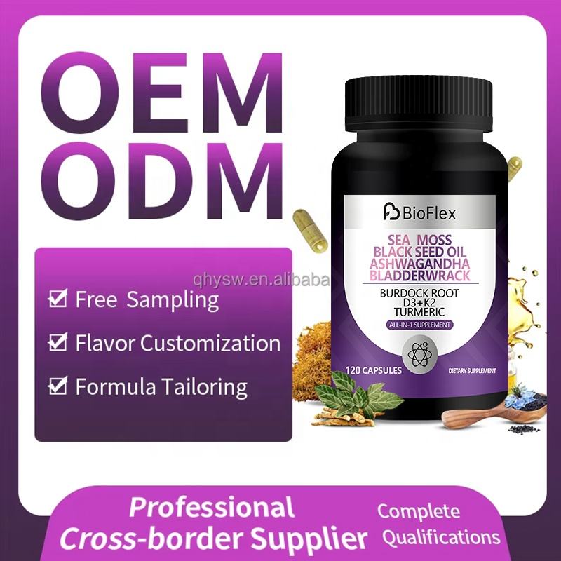 Cápsula de extracto de hierba de raíz de bardana de aceite de semilla negra de musgo de mar todo uno de etiqueta privada OEM antioxidante para adultos