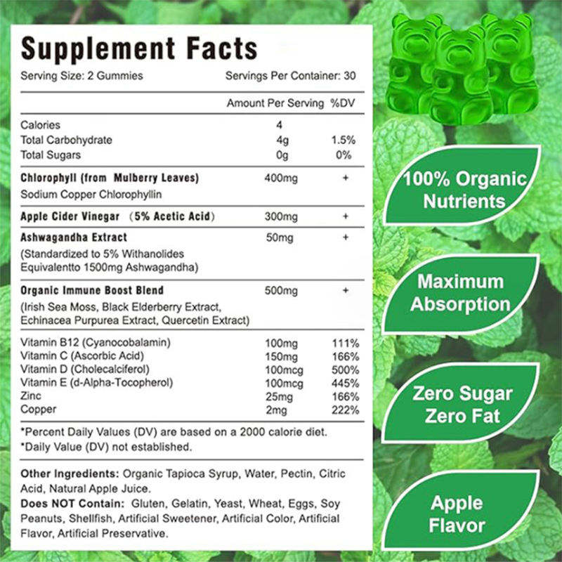 Ingrediente principal:Clorofila, Vitamina B12 C D E, Ashwagandha, Vinagre de Sidra de Manzana