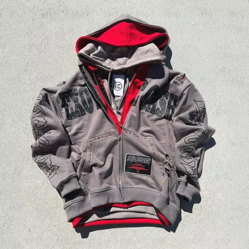 OEM ESPECIALES DE TEMPORADA 3 capas rasgado diamantes de imitación Zip up Hoodie hombres personalizado Vintage lavado impreso capa hombres Hoodie