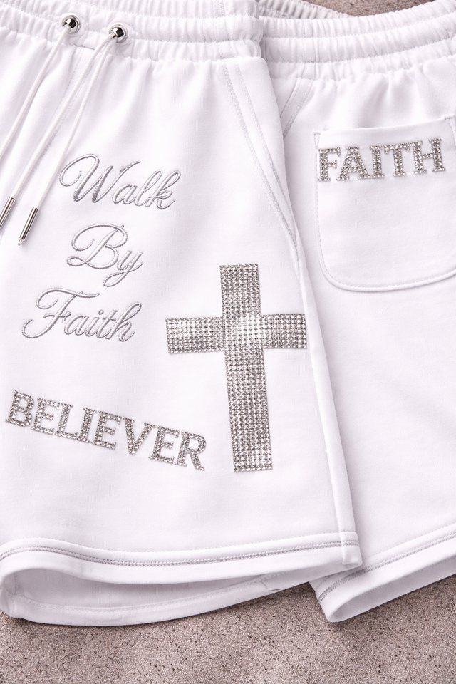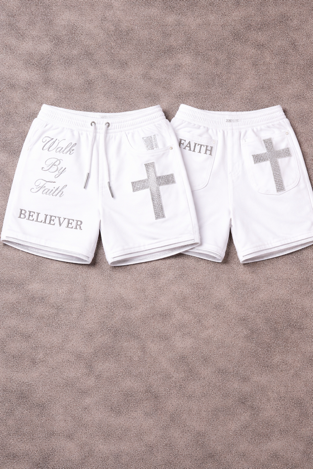 Servicio OEM al por mayor: Pantalones cortos de algodón para hombre con diseño de Jesús, lavado ácido y pedrería, personalizados, de marca privada, color blanco, nueva llegada.