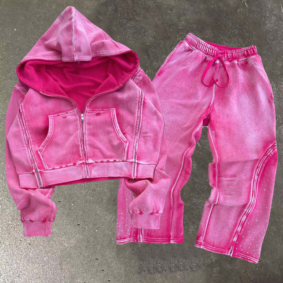 Conjunto Deportivo de Pantalones Holgados y Sudadera con Capucha para Hombre, Estilo Lavado Ácido, Tejido de Rizo Francés, Transpirable, con Estampado y Cremalleras Desmontables