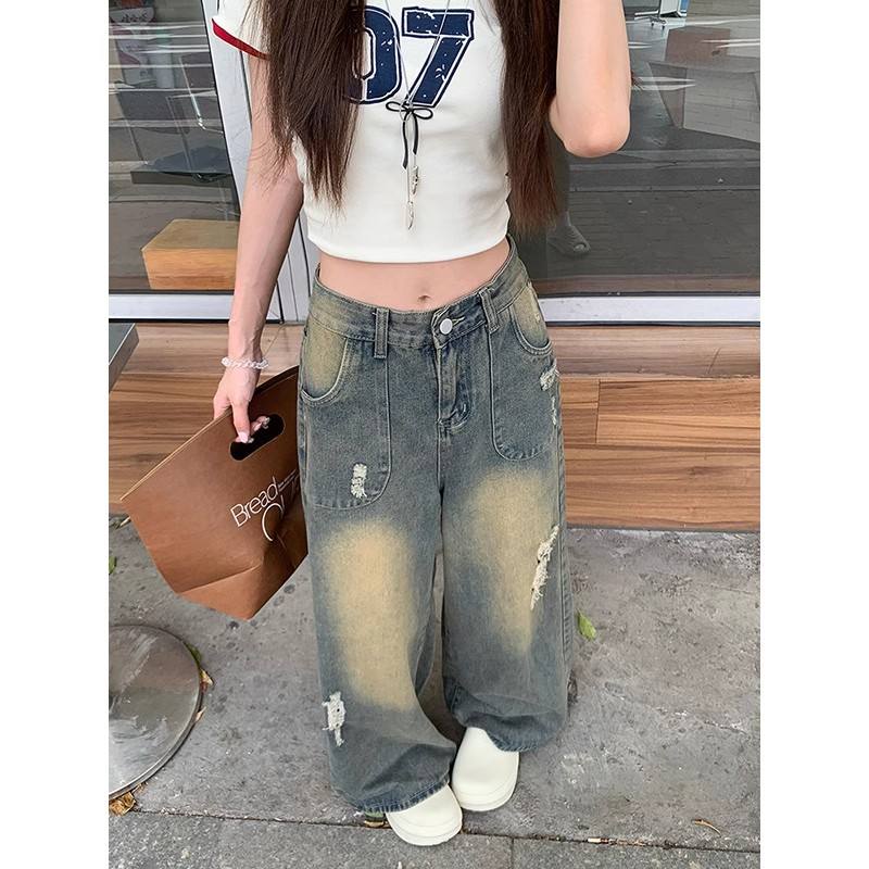 La tendencia OEM debe tener pantalones vaqueros desgastados degradados con piernas sueltas y anchas para crear un estilo informal y fresco