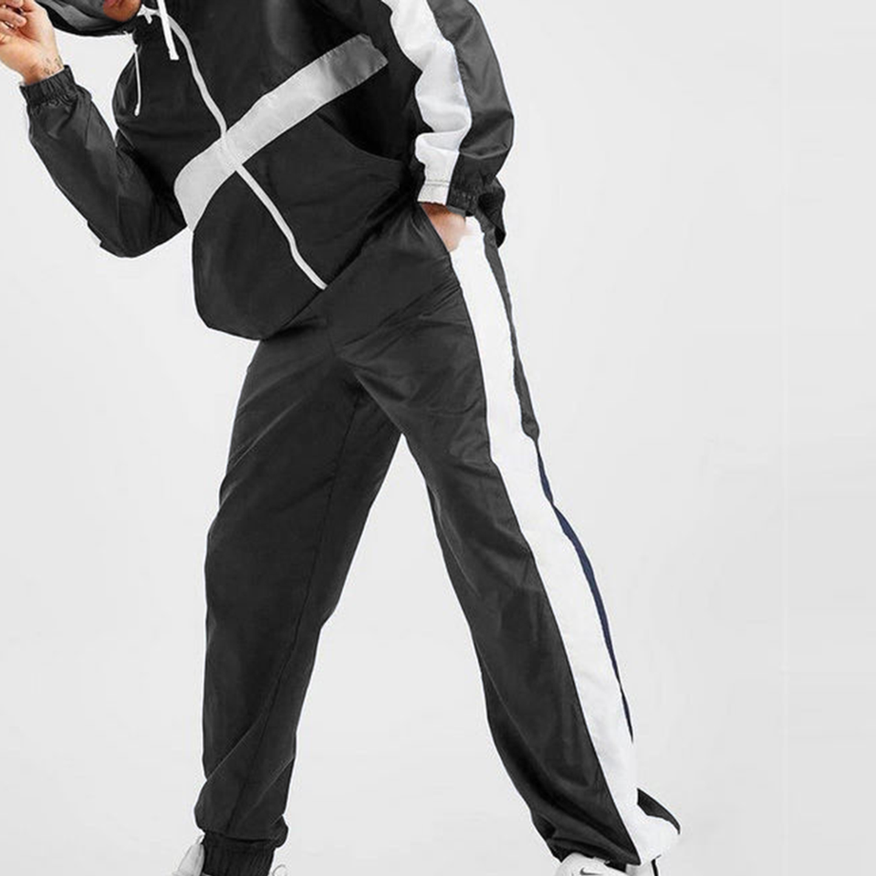 Conjunto de chándal de nailon de poliéster ligero impermeable OEM para hombre, chándales de diseño único cortavientos para exteriores con rayas laterales