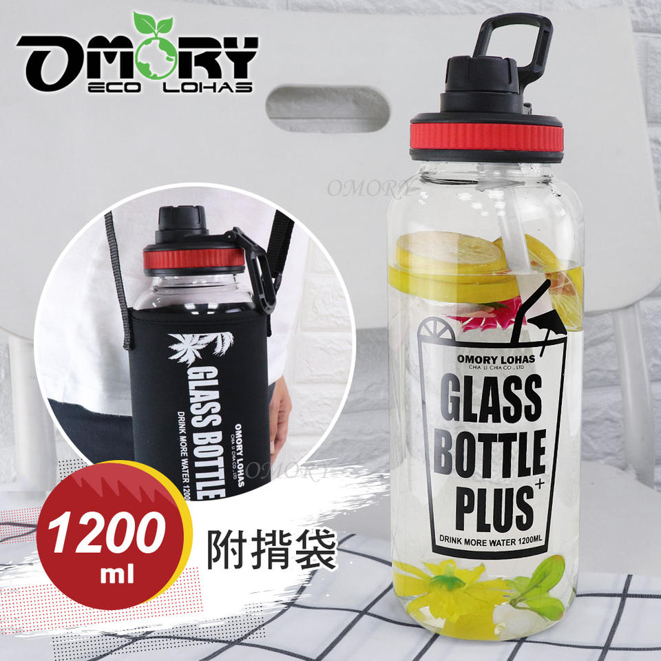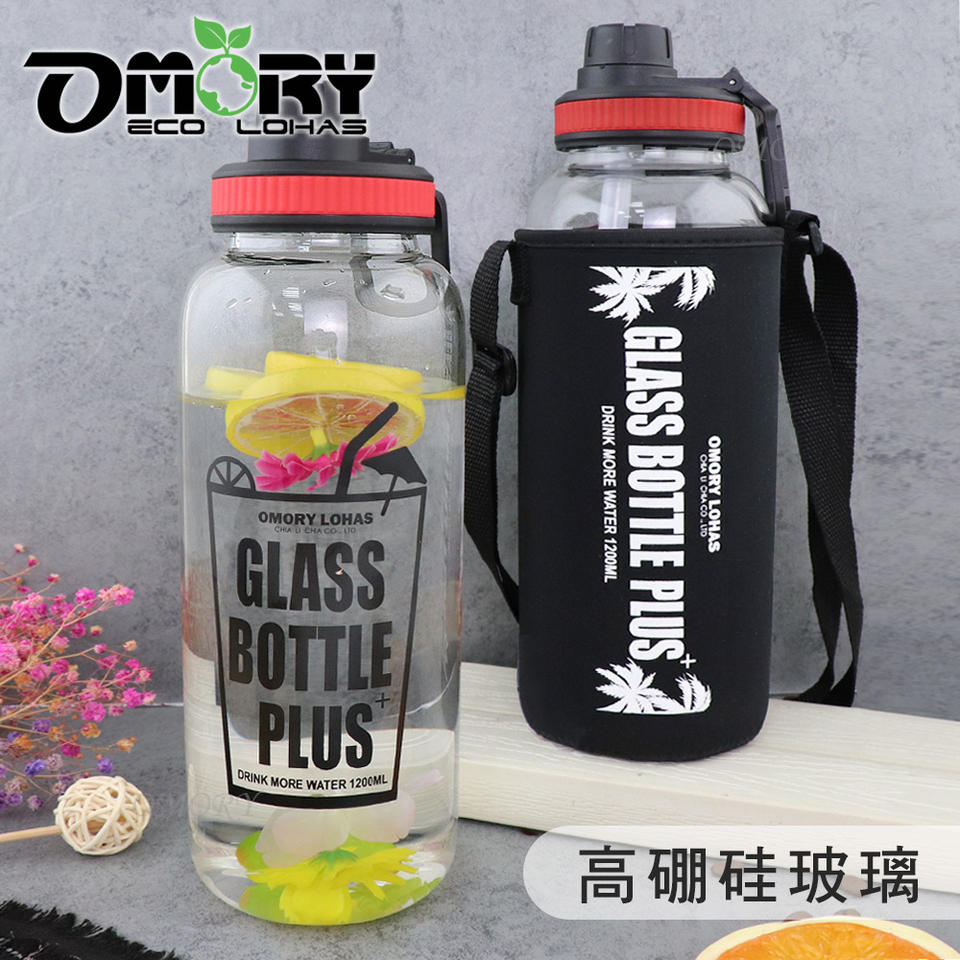 Botella de agua de vidrio OMORY de gran capacidad, 1200 ml, con bolsa, para fitness al aire libre.