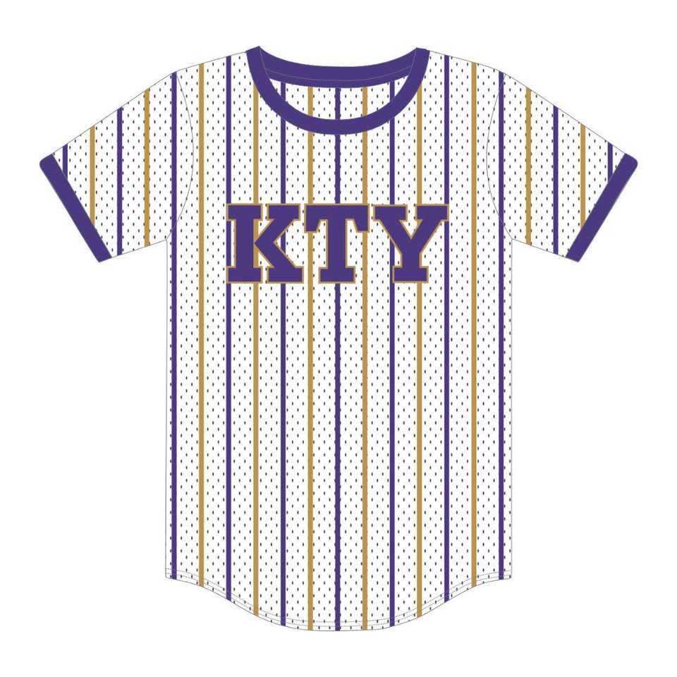 OPP White Pinstripe Pullover Camiseta de béisbol 100% Poliéster Malla Omega Fraternidad Camiseta con logotipo de apliques bordados personalizados