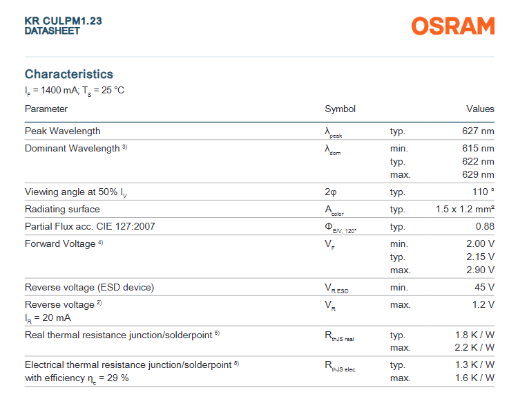 Chip LED de Alta Potencia OSRAM OSTAR Projection Compact KR CULPM1.23 Rojo 612-630 nm 187 lm 3.0W CRI 70-90 Ángulo de Visión de 120°