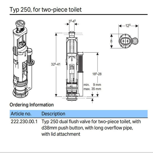 Descripción:Válvula de descarga dual para inodoro de dos piezas con botón de 38 mm
