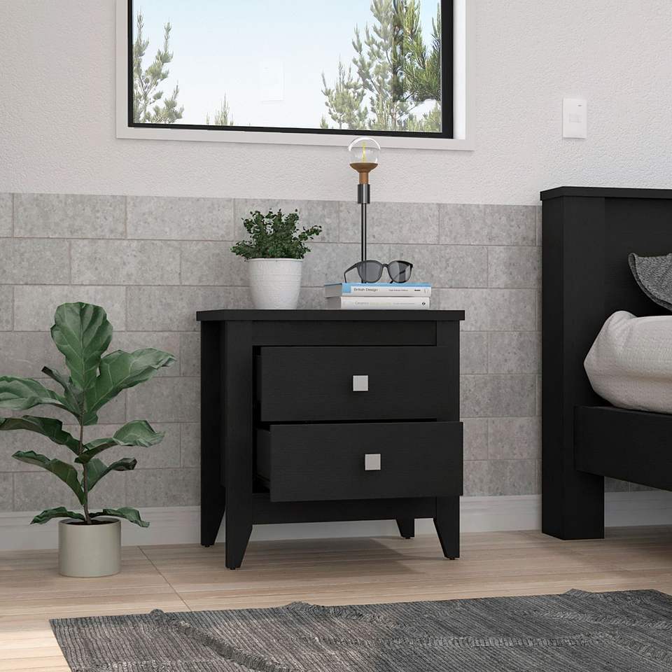 Mesita de noche Oasis de DB DEPOT de madera maciza moderna con cuatro patas, dos cajones, parte superior en negro para el hogar o el apartamento