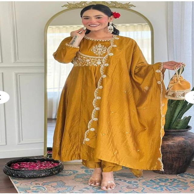 Desgaste ocasional de seda Vichitra con bordado y trabajo de codificación Pantalón Kurti y moda de mujer Dupatta al precio más bajo