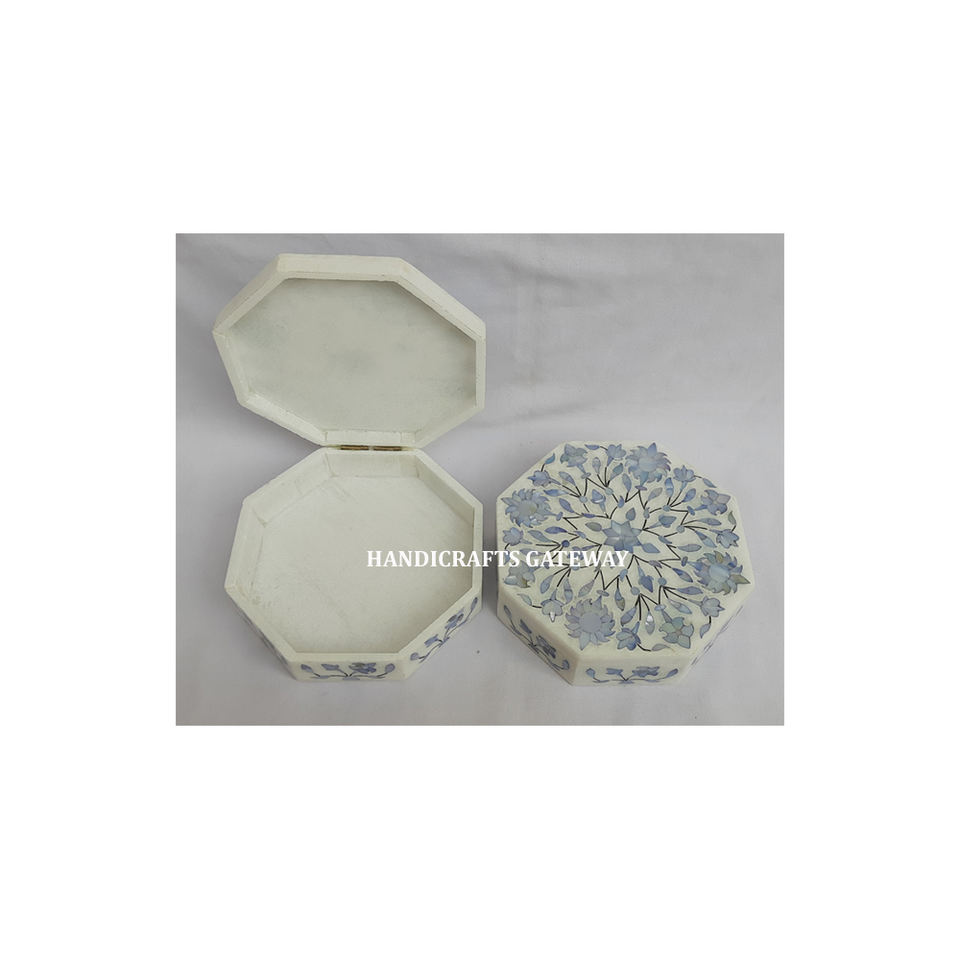 Caja de joyería de madreperla de mármol blanco con forma octogonal, trabajo de incrustaciones de flores hermosas, Color azul para regalo corporativo