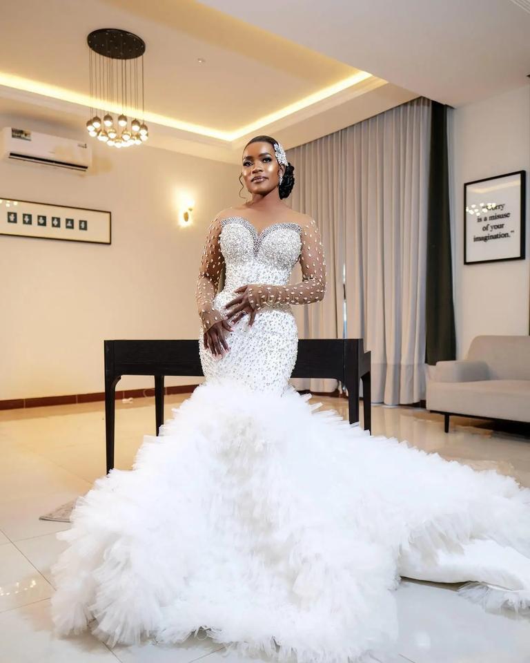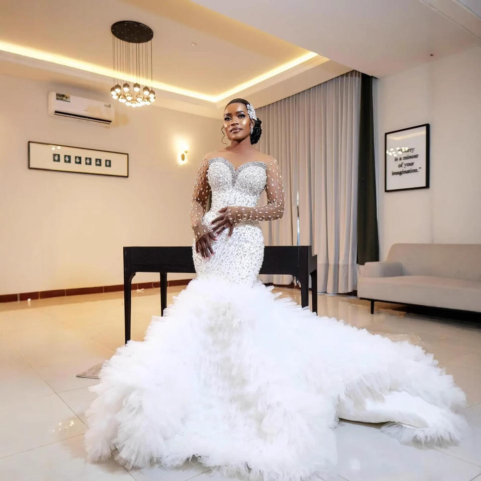 Vestido de Novia Moderno de Manga Larga sin Tirantes, de Lujo, de Alta Gama, Estilo Europeo Americano, Talla Grande, con Encaje Natural, con Cordones, Largo hasta el Suelo, Estilo Sirena