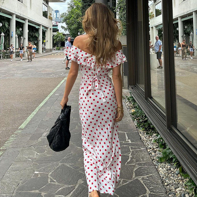 Vestido Casual con Hombros Descubiertos, Estampado de Lunares, Volantes, Falda Larga, Cintura Ajustada y Transpirable para Fiestas y Celebraciones